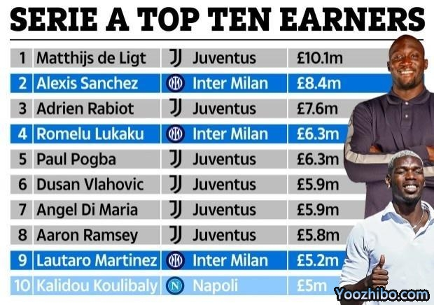 24直播网讯07月11日讯 今夏,卢卡库和博格巴重回意甲,迪马利亚也强势登陆,《太阳报》统计了新赛季意甲联赛的薪水排行榜,前十之中有六名尤文图斯球员。