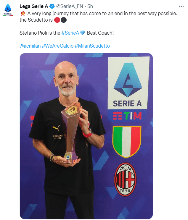 24直播网讯05月23日讯 意甲官方消息,AC米兰主帅皮奥利当选意甲赛季最佳主帅。