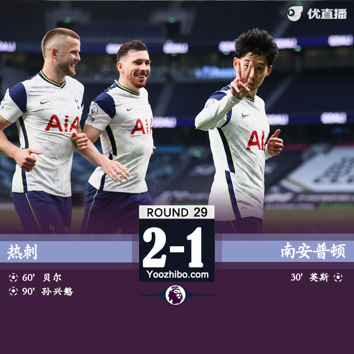 24直播网4月22日讯 北京时间4月22日凌晨1时,2020-2021赛季英超联赛第29轮的一场补赛展开角逐,热刺坐镇主场迎战南安普顿。上半场,丹尼-英斯头球破门,南安普顿半场1-0领先热刺。下半场,贝尔扳平比分,随后孙兴慜点球破门完成绝杀。最终热刺主场2-1击败南安普顿。