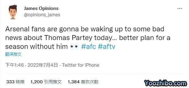 24直播网讯07月05日讯 《电讯报》今日爆料称,一位英超球员因涉嫌强奸在北伦敦被捕,而有球迷发现,在消息出来的10个小时前,有一名推特用户表示阿森纳本赛季将没有中场托马斯-帕特耶可用。