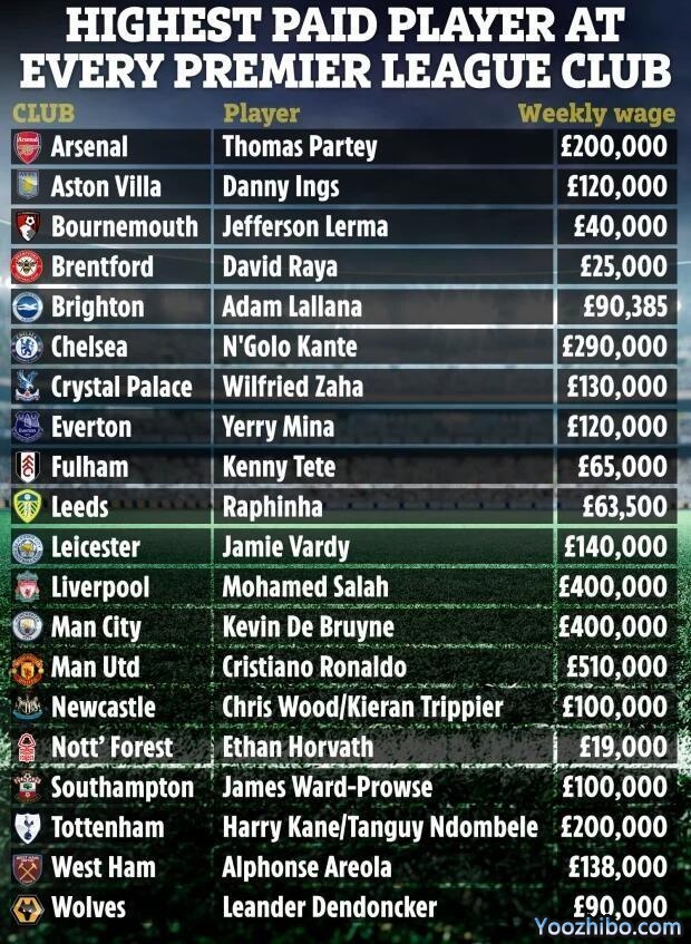 来源:24直播网07-04 12:2524直播网讯07月04日讯 《太阳报》援引Sportrac数据,统计了英超各队薪水最高的球员。