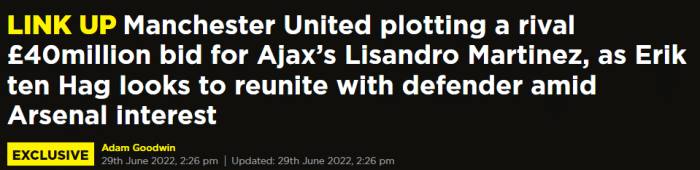 24直播网讯06月30日讯据talkSPORT电台报道,阿森纳向阿贾克斯开出3500万英镑的报价求购后卫利桑德罗-马丁内斯,而曼联则开价4000万英镑希望截胡。