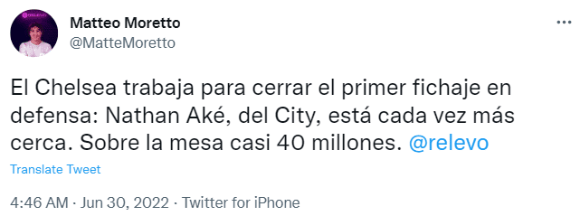24直播网讯06月30日讯 Relevo记者马特奥-莫雷托报道,切尔西为曼城后卫阿克报价4000万欧元,已接近签下他。