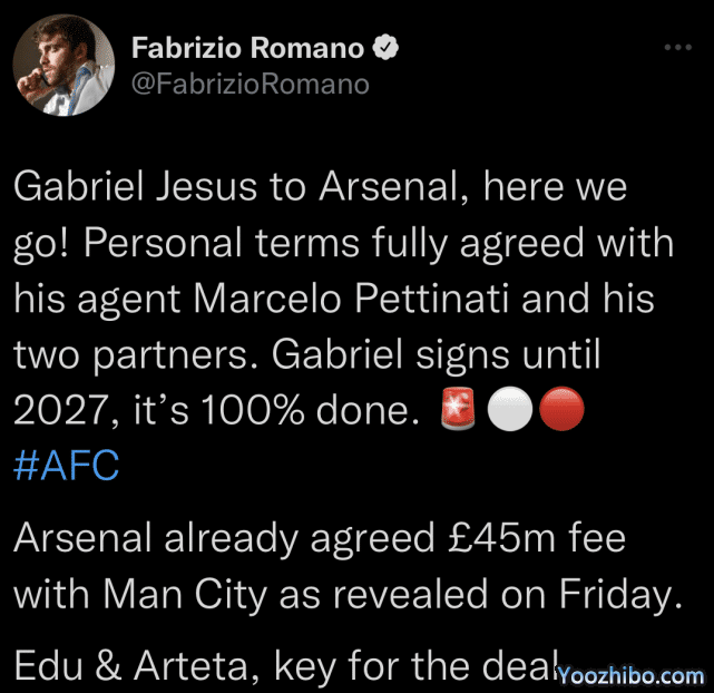 来源:24直播网06-27 18:1324直播网讯06月27日讯 日凌晨,知名转会专家罗马诺在个人社交账号上确认,巴西射手热苏斯的经纪人已经与阿森纳俱乐部达成协议。双方将签约5年至2027年。而热苏斯也将成为继马尔基尼奥斯和法比奥-维埃拉之后,阿森纳夏窗的第三位新援。
