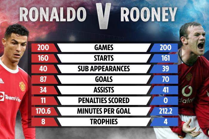 C罗打入87球,助攻34次,其中包括11个点球,拿到8项冠军;而鲁尼则是70球、41次助攻,没有点球,夺冠次数为4次。