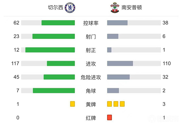 第84分钟,切尔西再次进球,巴克利斜传阿斯皮利奎塔,后者将球送到门前,维尔纳抓住机会推射得手,切尔西2-1南安普顿。