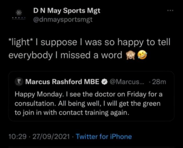 有趣的是,曼联妖星的这份声明还出了一点儿小乌龙。拉什福德的经纪人公司「DN May Sports Management」账号比他早4分钟发布了这一消息,随后又删除,并且关闭了官方账号。随后拉什福德自己的账号才重新发布这一消息。