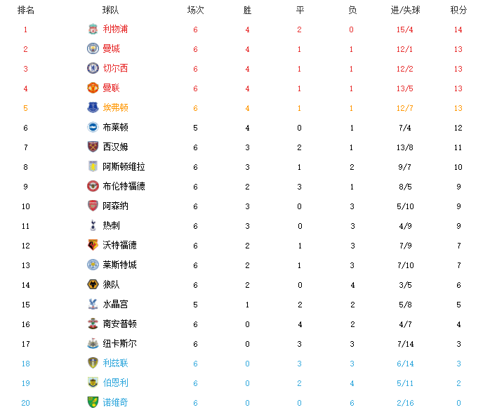 来源:24直播网09-27 11:0124直播网讯9月27日讯 ,英超第6轮北伦敦德比落下帷幕,阿森纳主场3-1大胜热刺,收获三连胜,从开局的三连败到如今的三连胜,还大胜了死敌热刺,枪手彻底崛起。本轮英超只剩下布莱顿和水晶宫的比赛没有开始,接下来我们看看英超最新排名: