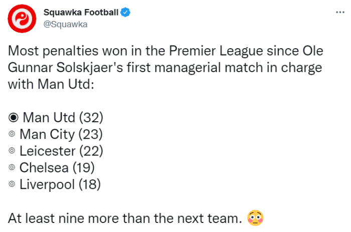 24直播网讯9月25日讯 据知名数据网站squawka统计,自从索尔斯克亚上任后,曼联已经在英超联赛获得32个点球,是所有英超球队中最多的。