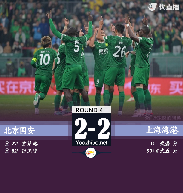 24直播网讯:北京时间4月5日中超 联赛 第4轮,北京国安主场对阵上海海港。上半场,武磊首开纪录,古加扳平比分,法比奥伤退;下半场,方昊造点,张玉宁点射反超比分,补时武磊完成绝平。最终,北京国安2-2战平上海海港。